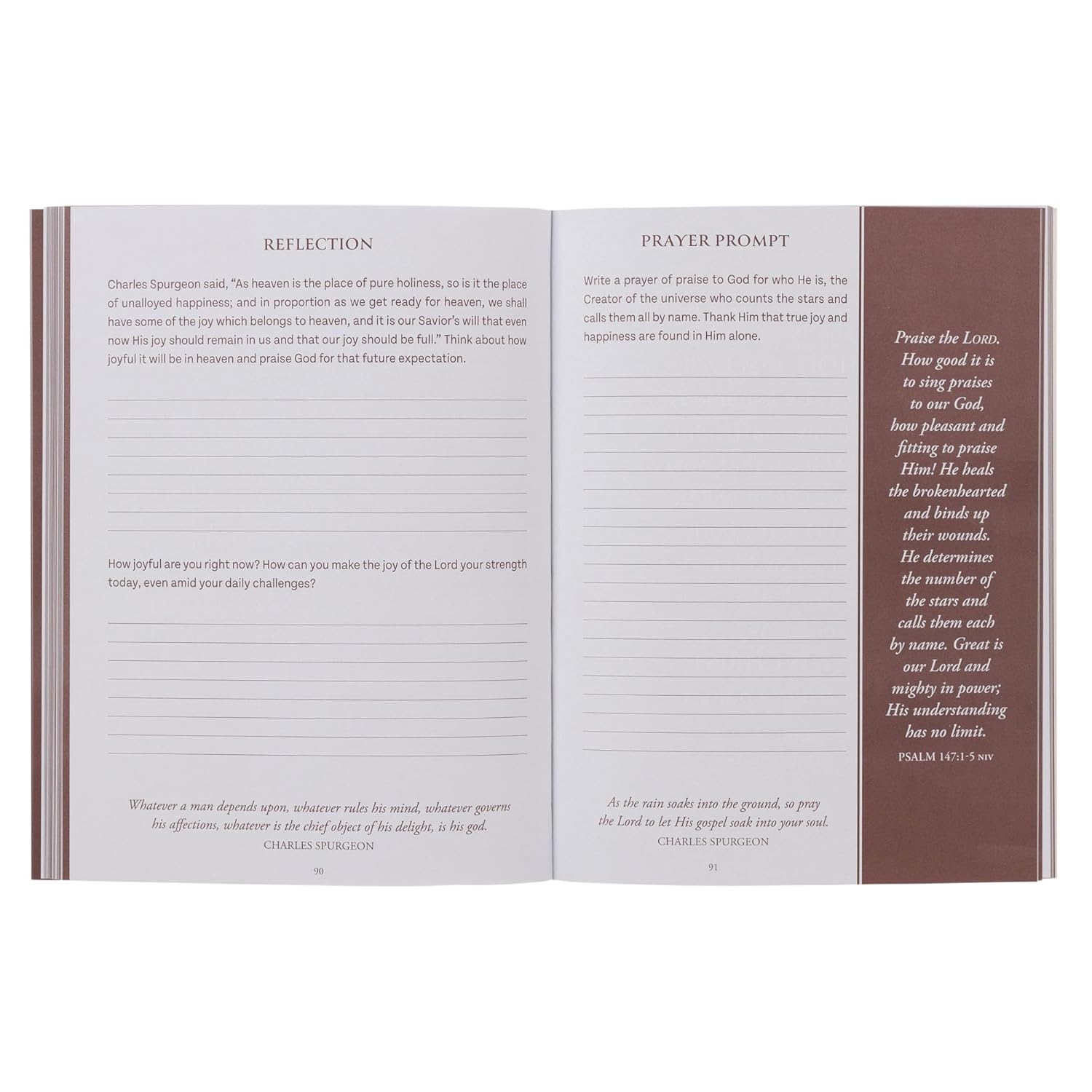 Every reading opens with a full-page Scripture design or quote, followed by devotional content that draws out biblical lessons and historical insight. This is followed by a lined reflection page and a prayer-writing prompt page to help you express your heart to God.